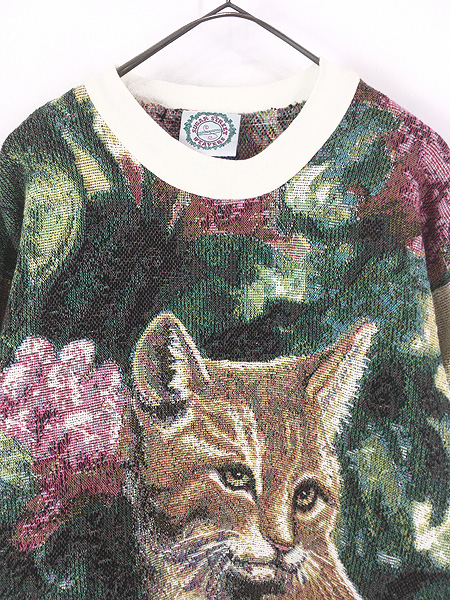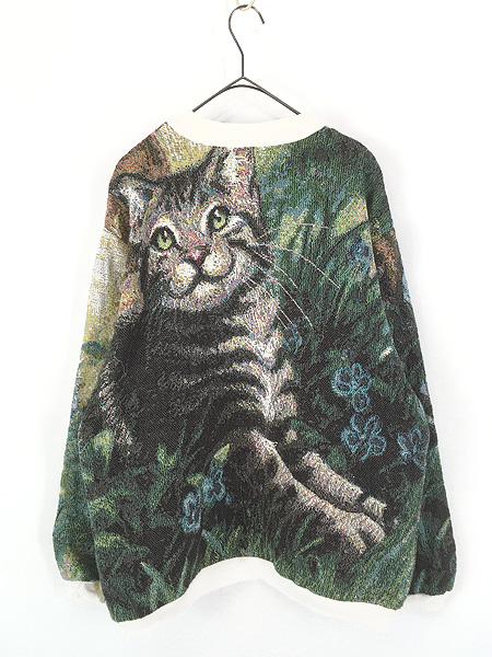 レディース 古着 90s USA製 SUGAR STREET 猫 ねこちゃん ゴブラン コットン ニット セーター XL位