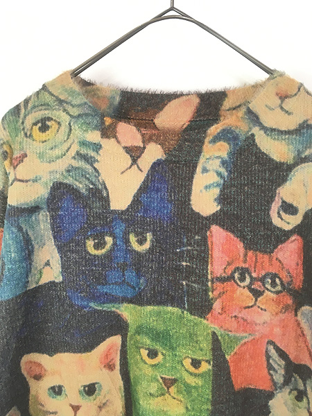 古着 猫 マルチ キャット アート オールオーバー コットン ウール ライト ニット セーター XL位