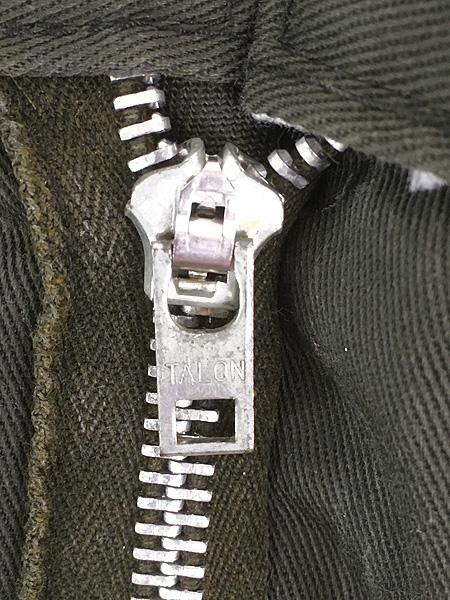 強度のあるコットンポリ素材・TALONジップ・年代特有の調整用ウエストの縫い合わせ・股下ガゼットクロッチ・ストレートシルエット。深みのあるオリーブカラーも年代ならでは。